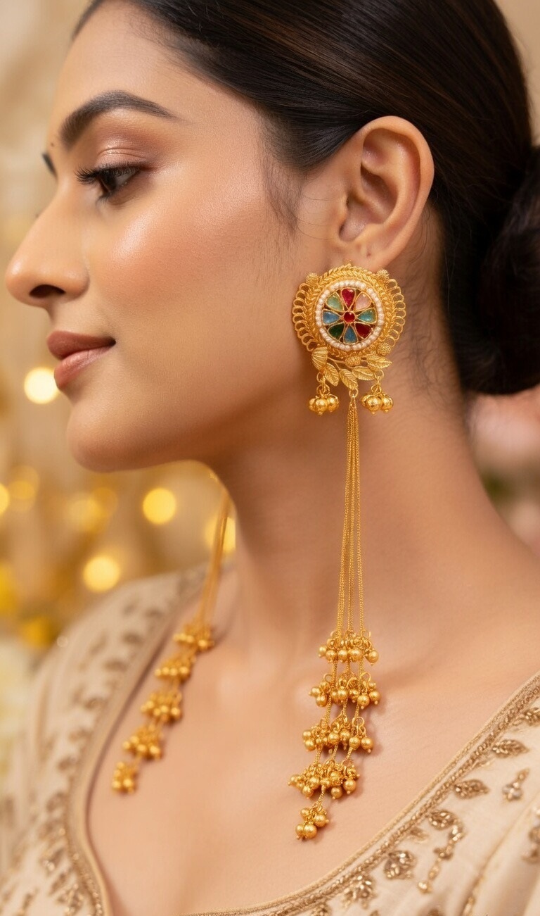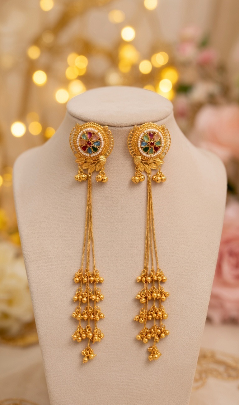 Lightweight, elegant Kashmiri earrings with multicolor stone detailing. Gold-plated finish shines beautifully. Long tassels add graceful movement.